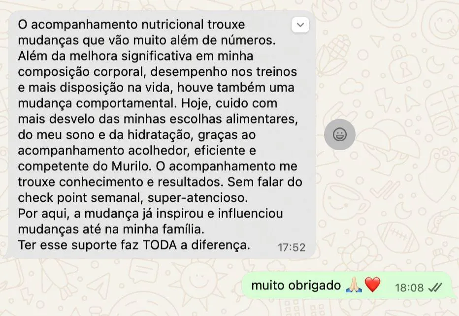 Murilo Lanes não entrega apenas planos alimentares; ele entrega estratégias de vida. Com mais de 14 anos de tatame e uma trajetória de superação pessoal, ele entende que a alimentação precisa ser um facilitador, não um fardo.